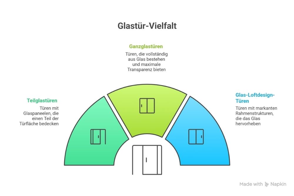 → Die folgende Grafik zeigt die Vielfalt eigenständiger Glastür-Gruppen und unterscheidet zwischen Teilglastüren, Ganzglastüren und Glas-Loftdesign-Türen anhand ihres jeweiligen Glasanteils und ihrer gestalterischen Wirkung.
