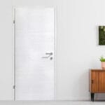 Natürlich, nordisch, modern: Die Innentür mit Zarge in weiß spritzlackierter Kieferoptik wirkt durch ihre quer verlaufende Furnierung besonders zeitgemäß und freundlich. Die fein strukturierte Oberfläche bringt Bewegung in den Raum, ohne dabei unruhig zu wirken. Die weiße Lackierung sorgt für Helligkeit und Leichtigkeit – ideal für skandinavische Wohnkonzepte, klare Architektur oder kreative Kombinationen.