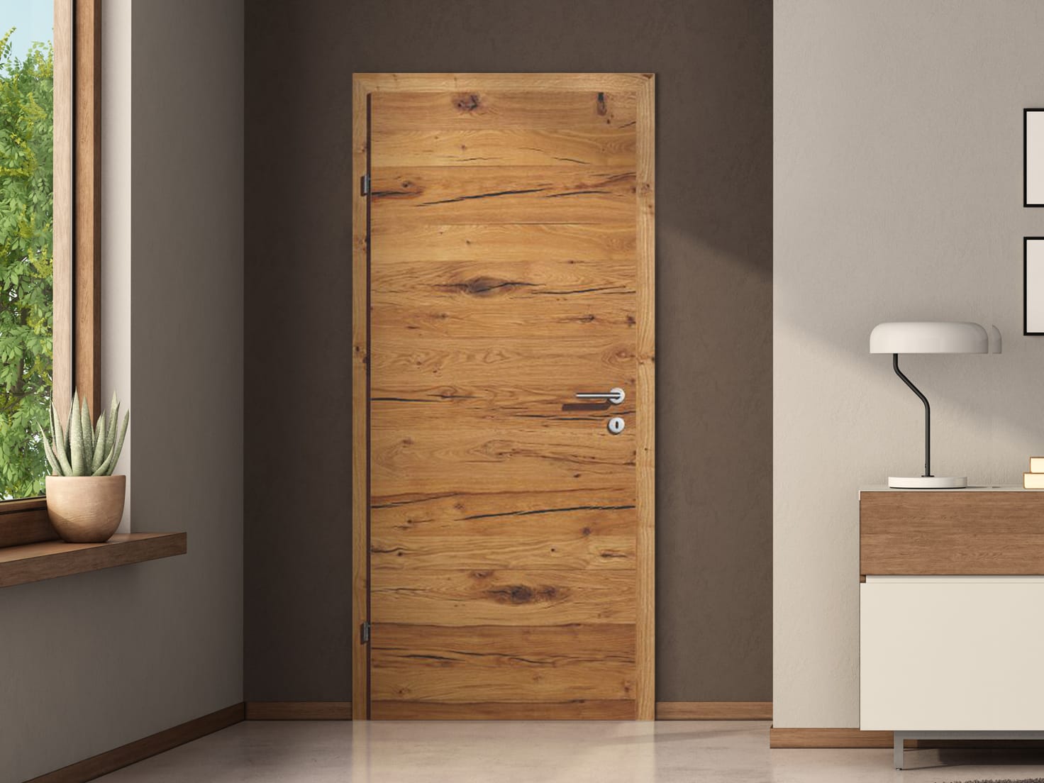 Roh, ausdrucksstark und raffiniert verarbeitet: Diese Innentür mit Zarge in Spliteiche quer furniert verkörpert pure Naturkraft und modernes Design zugleich. Die charakterstarken Risszonen des Holzes wurden bewusst schwarz gekittet, wodurch spannende Kontraste entstehen, die jeder Tür eine unverwechselbare Tiefe und Authentizität verleihen. Die naturlackierte Oberfläche sorgt für ein offenporiges Finish, das die Struktur spürbar macht und das lebendige Farbspiel der Eiche perfekt zur Geltung bringt – robust, greifbar und zeitlos schön.